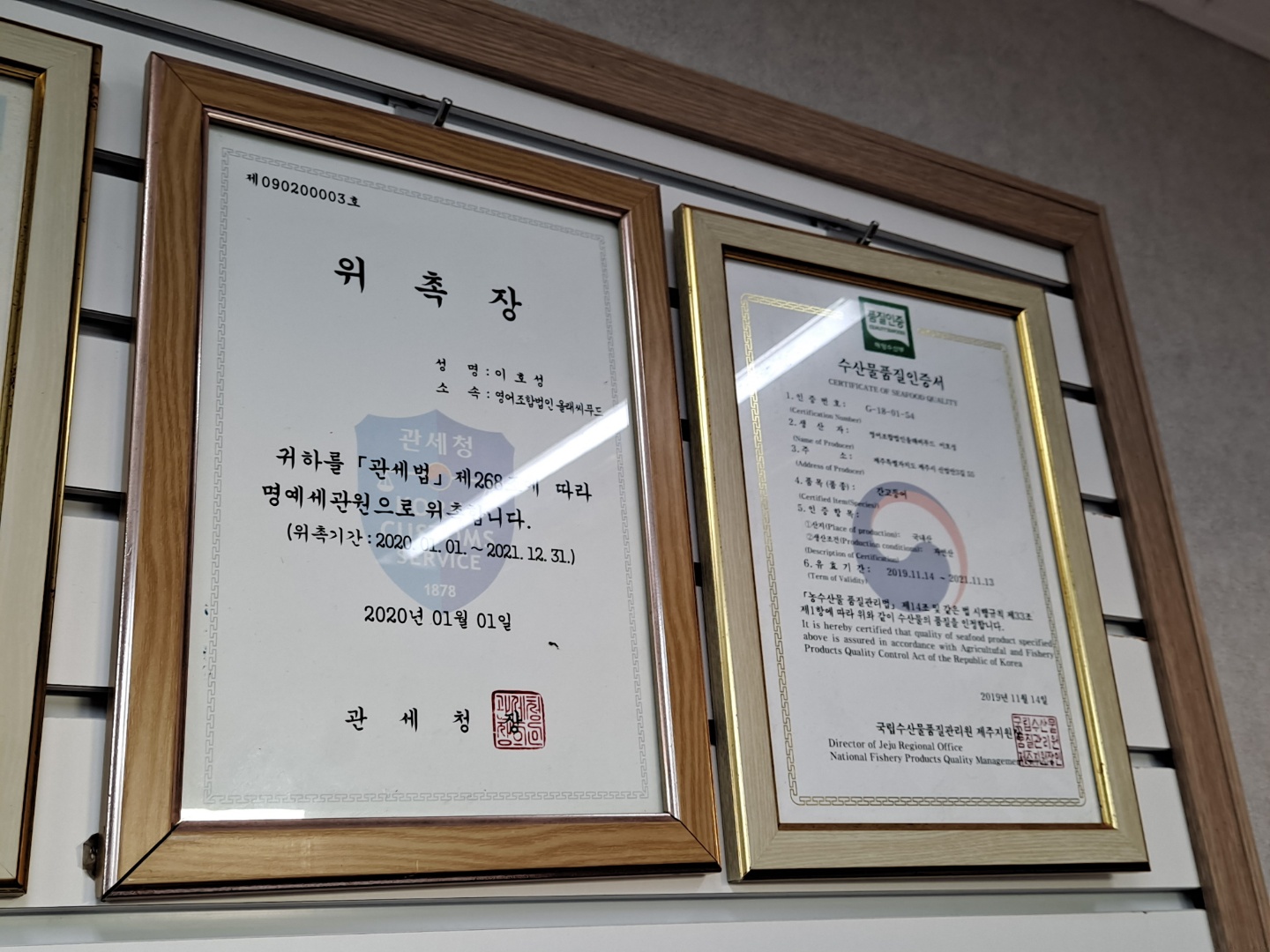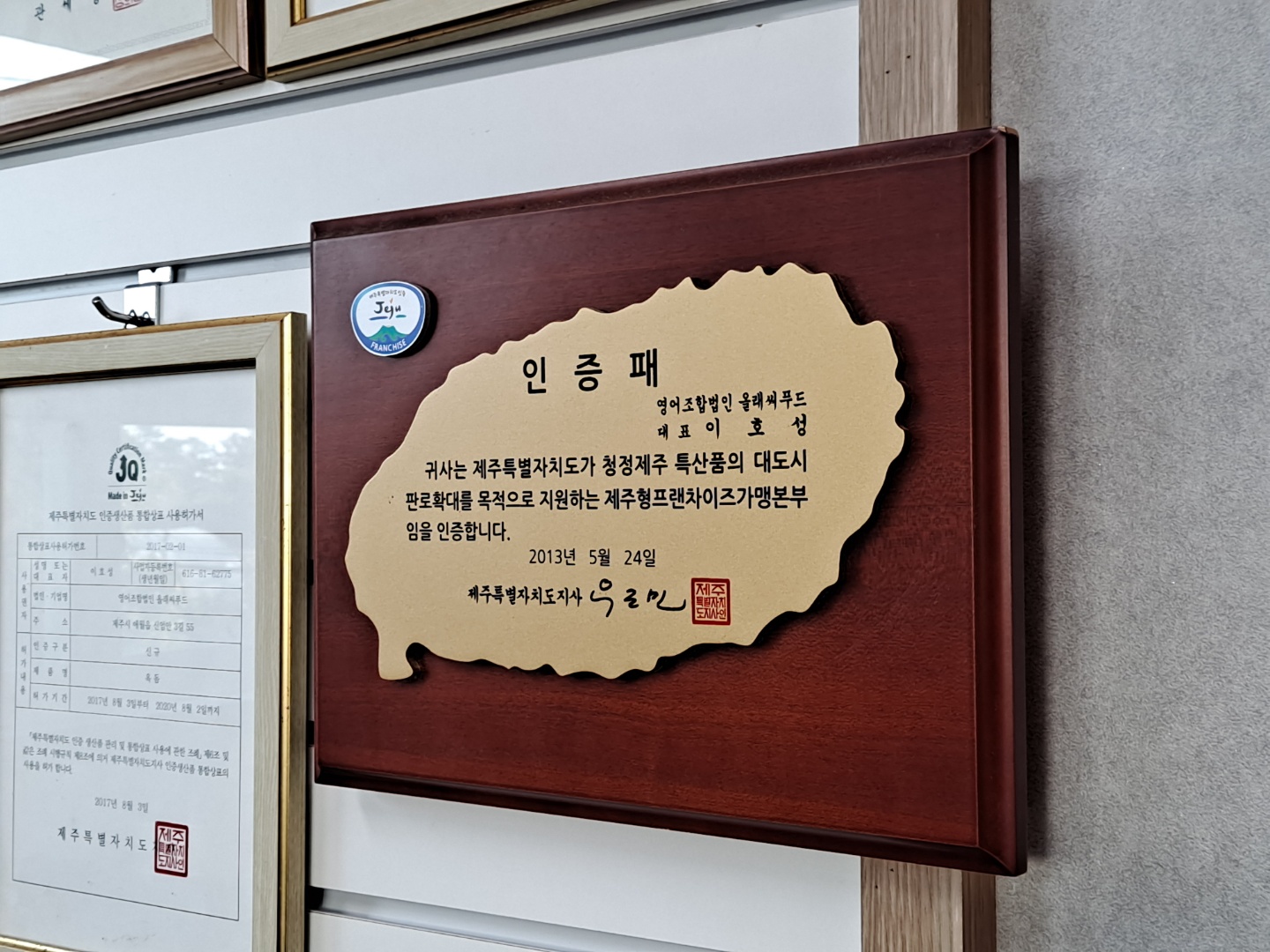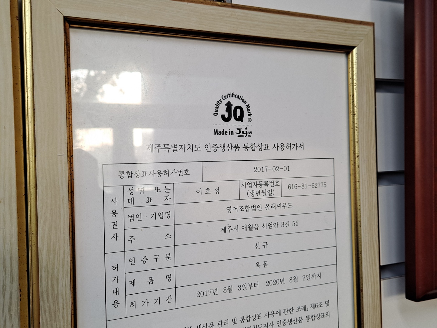 수산물 품질 인증서와 특허증, 올래 상표권, 제주에서 인증하는 마크인 제주마씸에 이어서 JQ 마크도 보입니다.