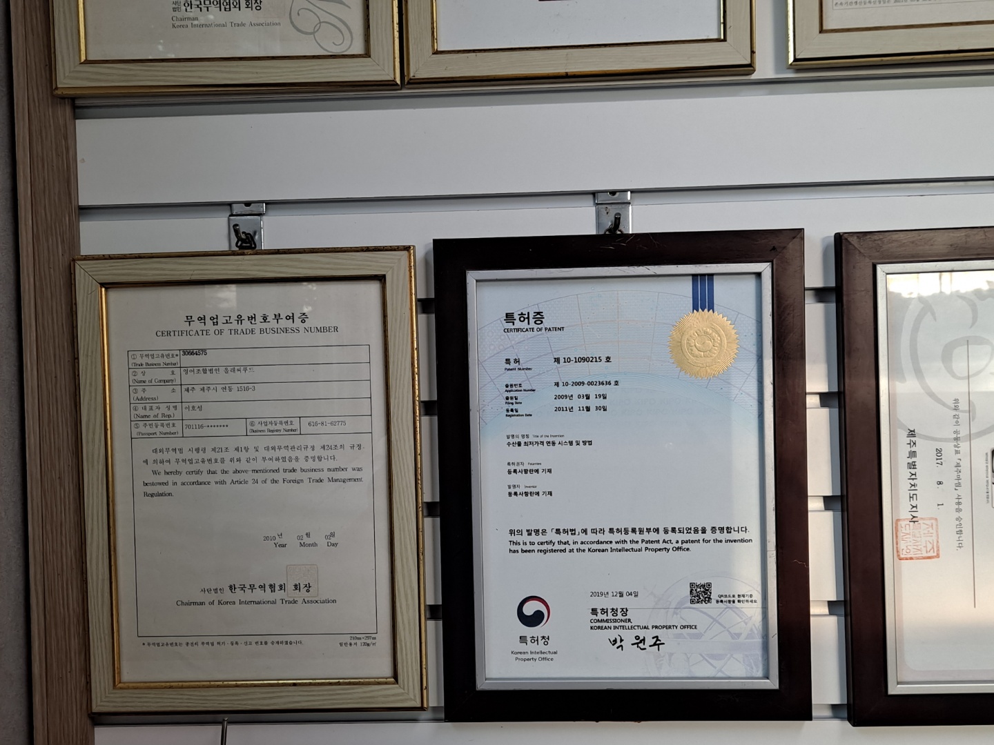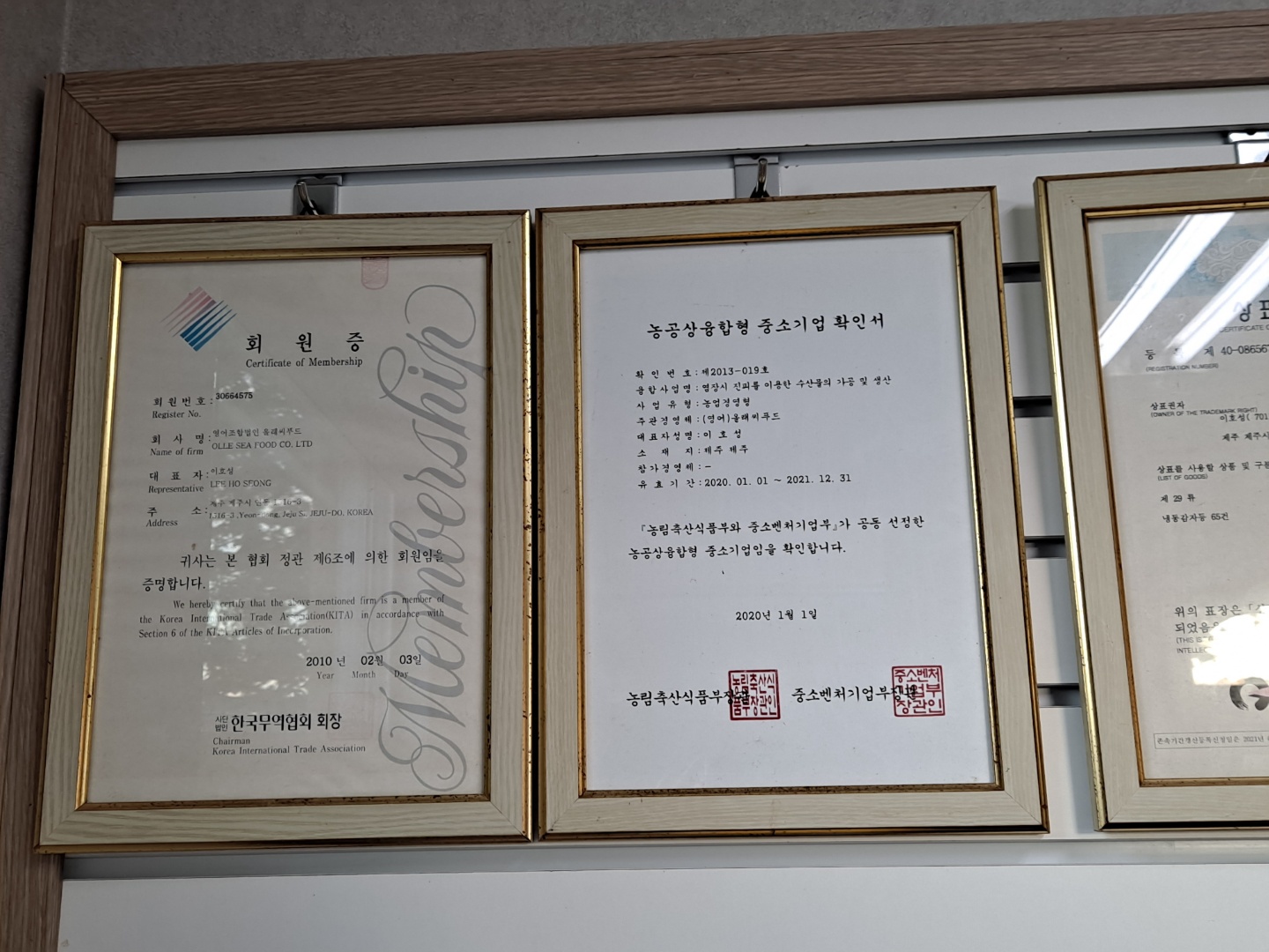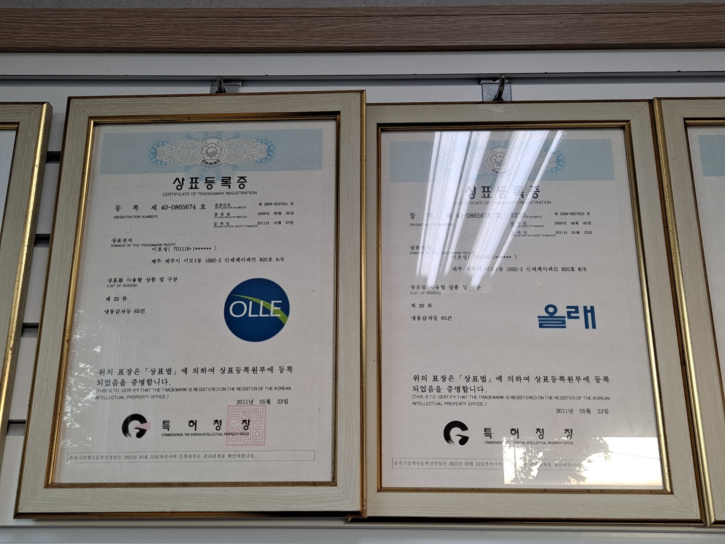 수산물 품질 인증서와 특허증, 올래 상표권, 제주에서 인증하는 마크인 제주마씸에 이어서 JQ 마크도 보입니다.
