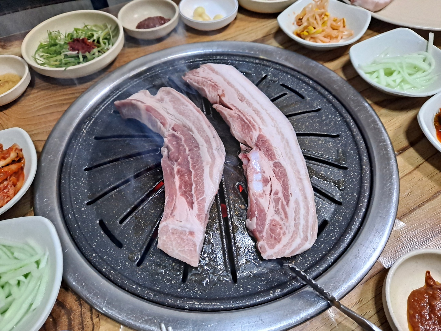 노릇노릇하게 익은 흑돼지를 멜젓 듬뿍 찍어 먹어봅니다