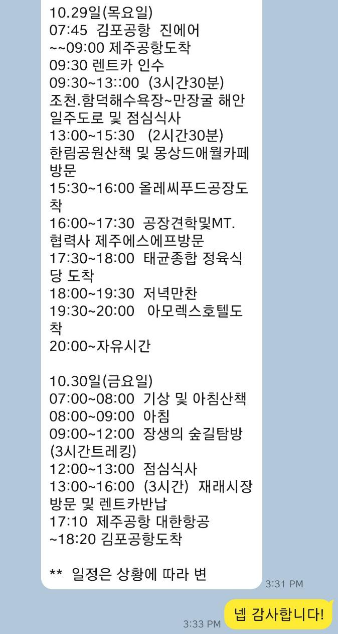 2팀(1박 2일 일정)으로 오시는 분들은 위 일정으로 제주도 도착해서 관광 후