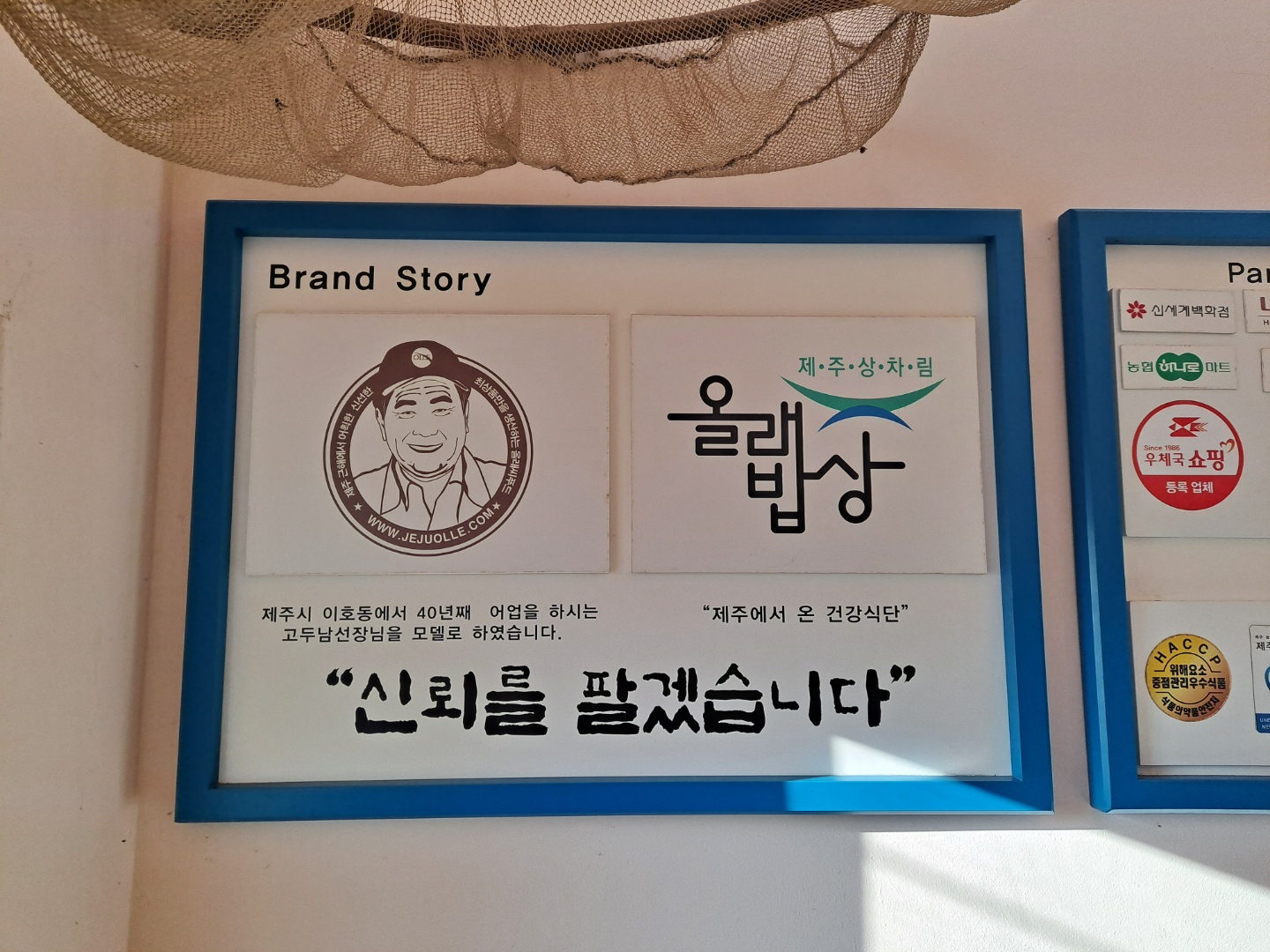 벽면에 올래 밥상의 브랜드 스토리가 차례차례 걸려있습니다.